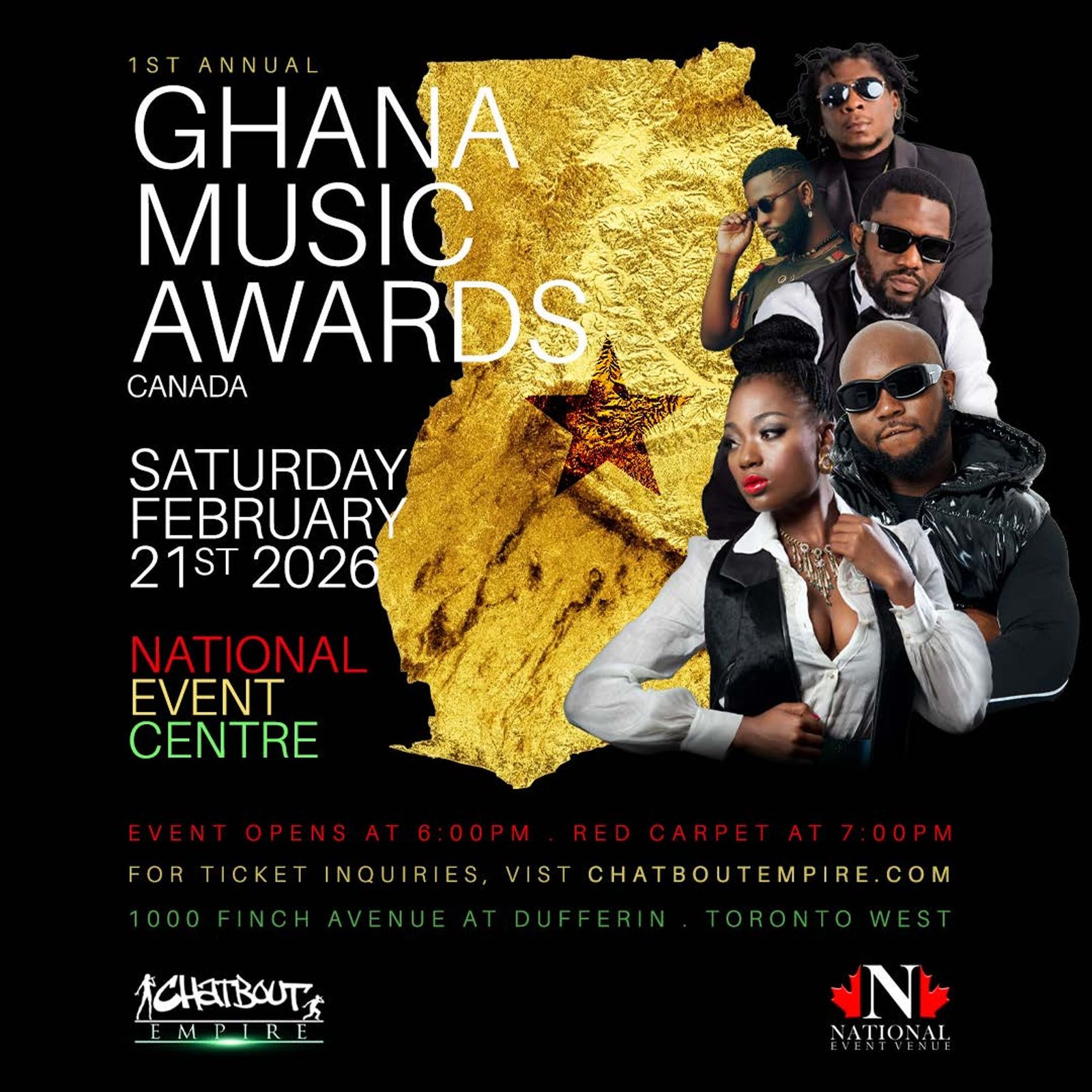 Get ready for an unforgettable night at the 1st Annual Ghana Music Awards Canada! Join us on Saturday, February 21st, 2026, at the prestigious National Event Centre in Toronto as we celebrate Ghanaian music, culture, and artistry on a global stage.